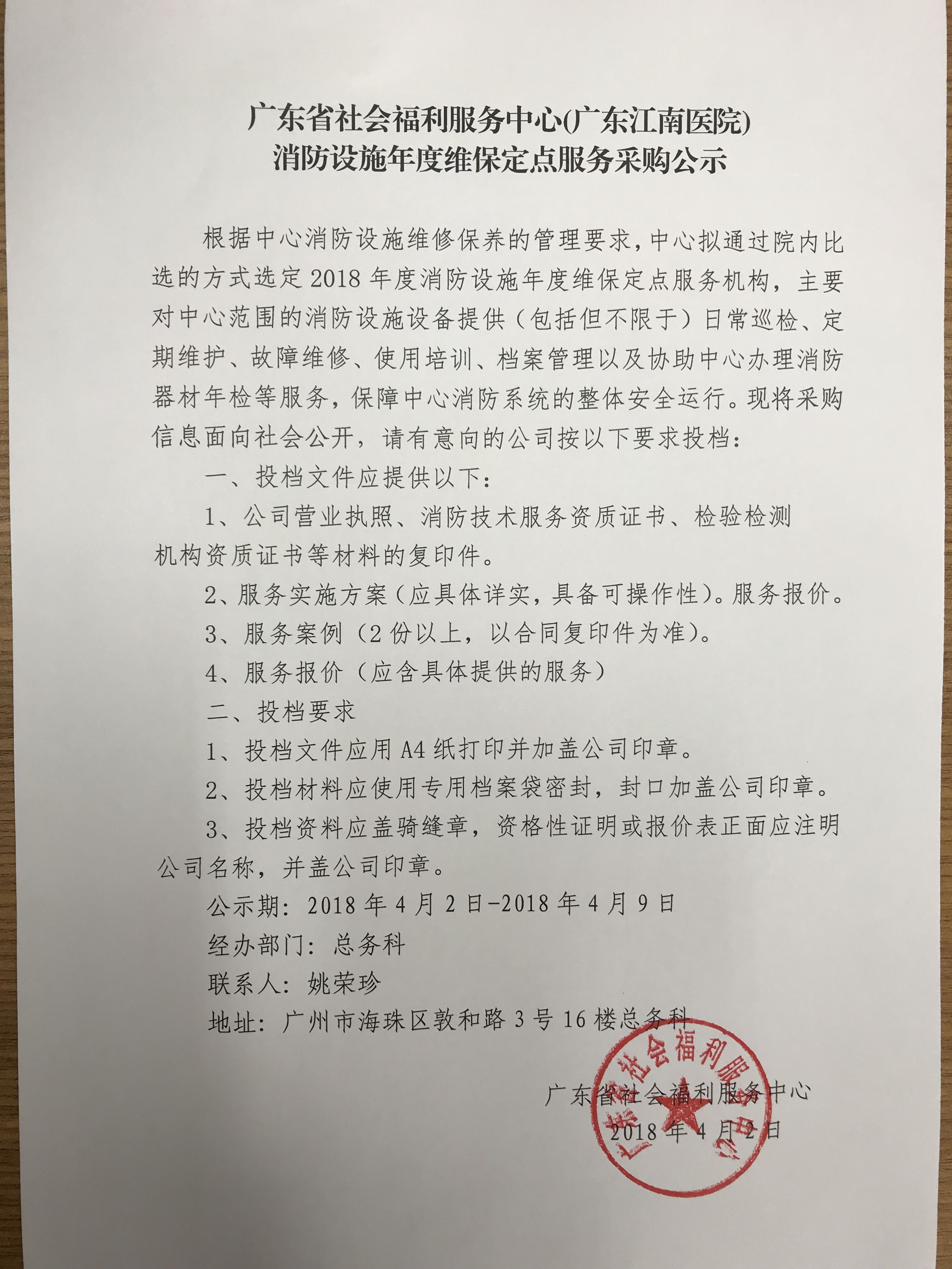 广东省社会福利服务中心(广东江南医院)消防设备年度维保定点服务采购公示
