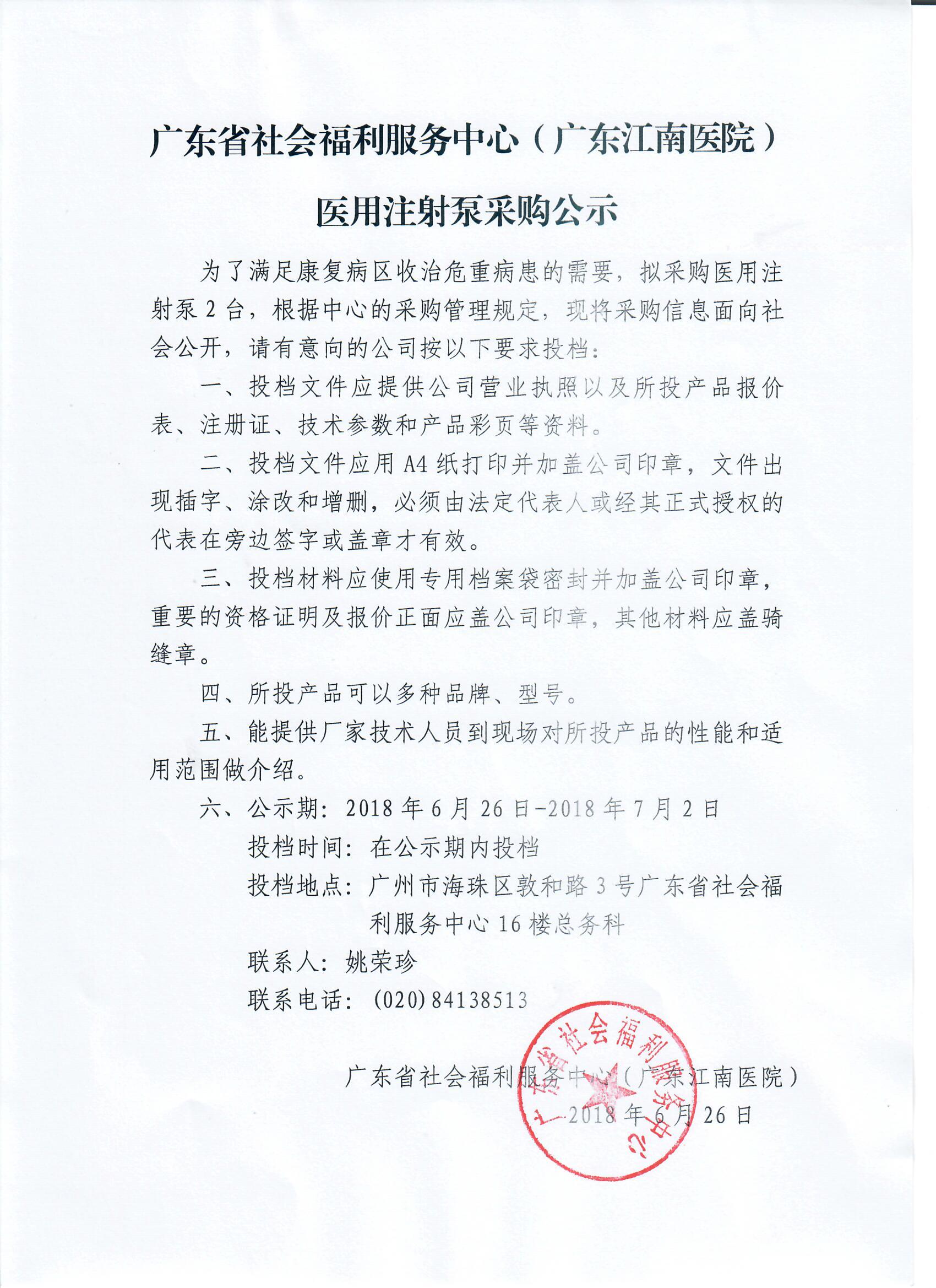 > 广东省社会福利服务中心(广东江南医院)医用注射泵采购公示
