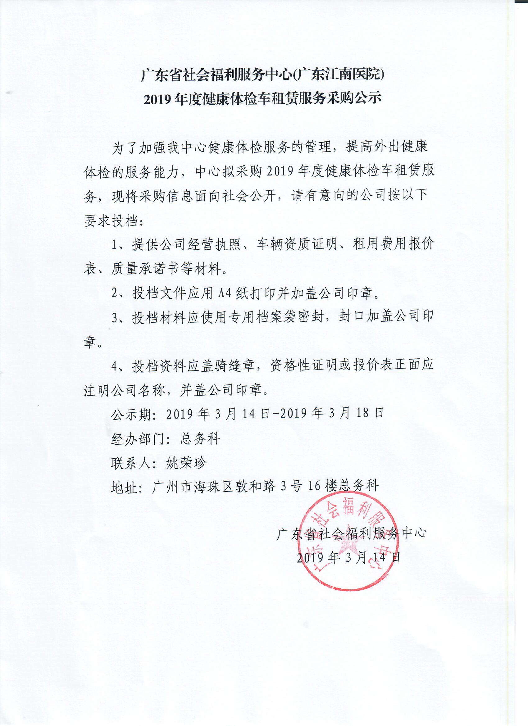 广东省社会福利服务中心(广东江南医院)2019年度健康体检车租赁服务采购公示
